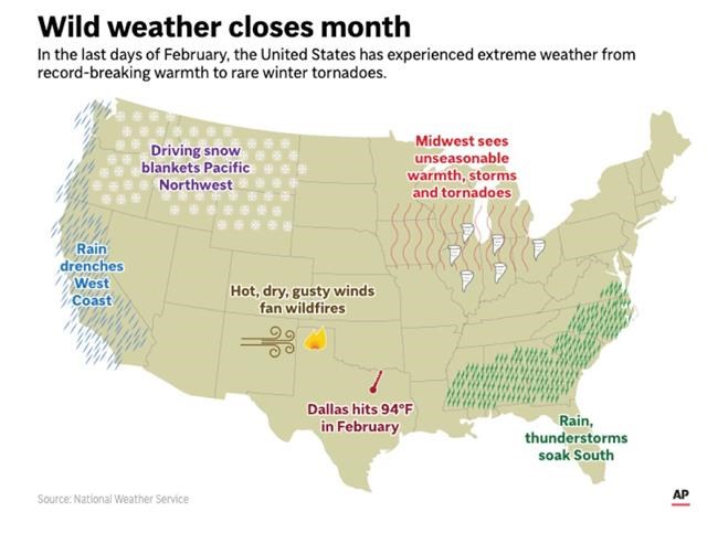 CHICAGO – Severe storms that appear to have spawned a rare February tornado outbreak sent sleeping Midwesterners scrambling for safety and left a trail of damage and power outages across four Great Lakes states, including the Chicago suburbs, ending a spell of summerlike, sometimes record temperatures.