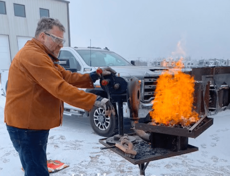 “Usually I have a minimum of two forges with me and eight to ten anvils, hand tools and grinders and things like that. If we’re doing like the railway spike knife making class I have bench grinders that we use to finish off a knife with,” he said.