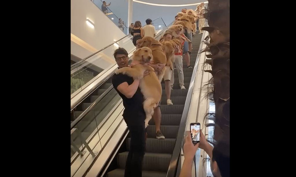 This parade of doggos been carried by their humans down an escalator is about as cute as it gets.
