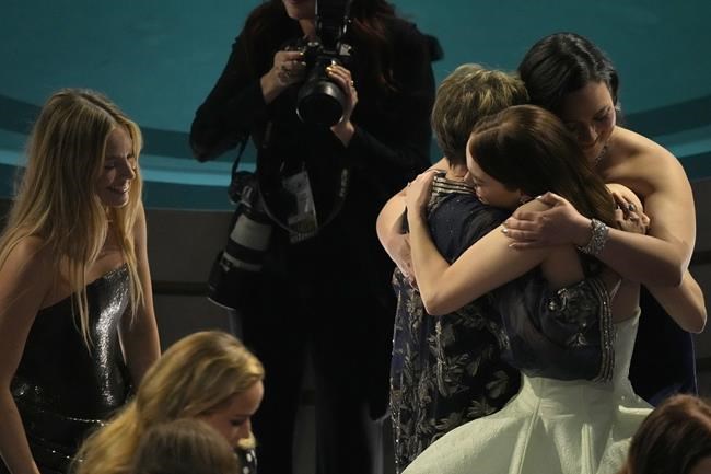 Stone hugged each of the five previous best actress winners who introduced the nominees.