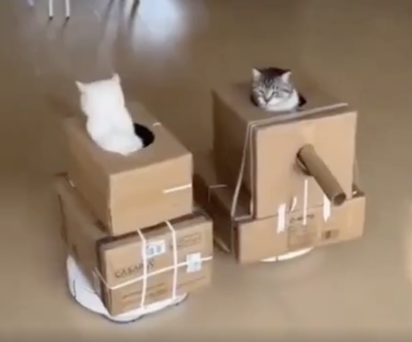 Once they were friends, but they have mounted their Roombas and become enemies.