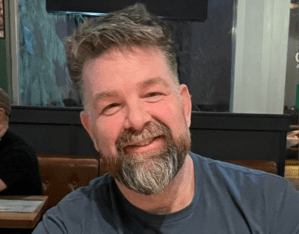 “It wasn’t me,” the man yells as he leads the horse and police officer into the street, stopping traffic.