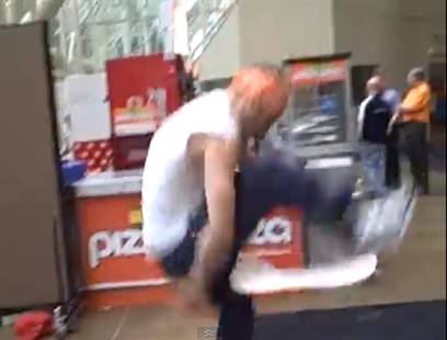 Not sure just how much 'dough' this guy makes for his special tricks, but if you eat pizza there, you gotta wonder how many times he practiced this—and failed. Really—would you eat this sweaty pizza when he was done with it?