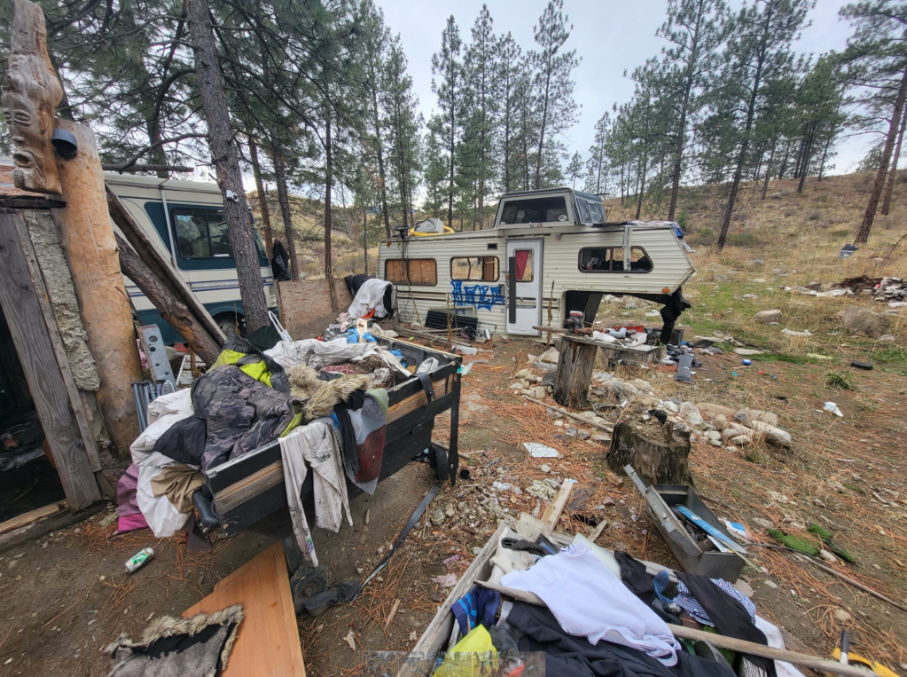 Recently the task force located a large dump site near Okanagan Falls with RVs, household trash, burnt cars, and other garbage. The task force organized a clean-up event today to attempt to tackle some of the garbage in the local woods.