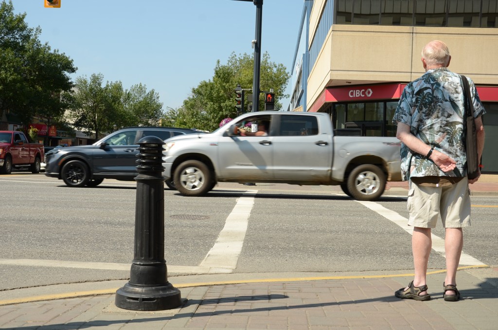 Standing at the busy intersection where the highway to and from Kelowna crosses Vernon's main downtown shopping street it's easy to see why people say it is dangerous. The sheer amount of traffic passing across a busy pedestrian-heavy street makes a person stand well back from the edge of the sidewalk when waiting to cross.