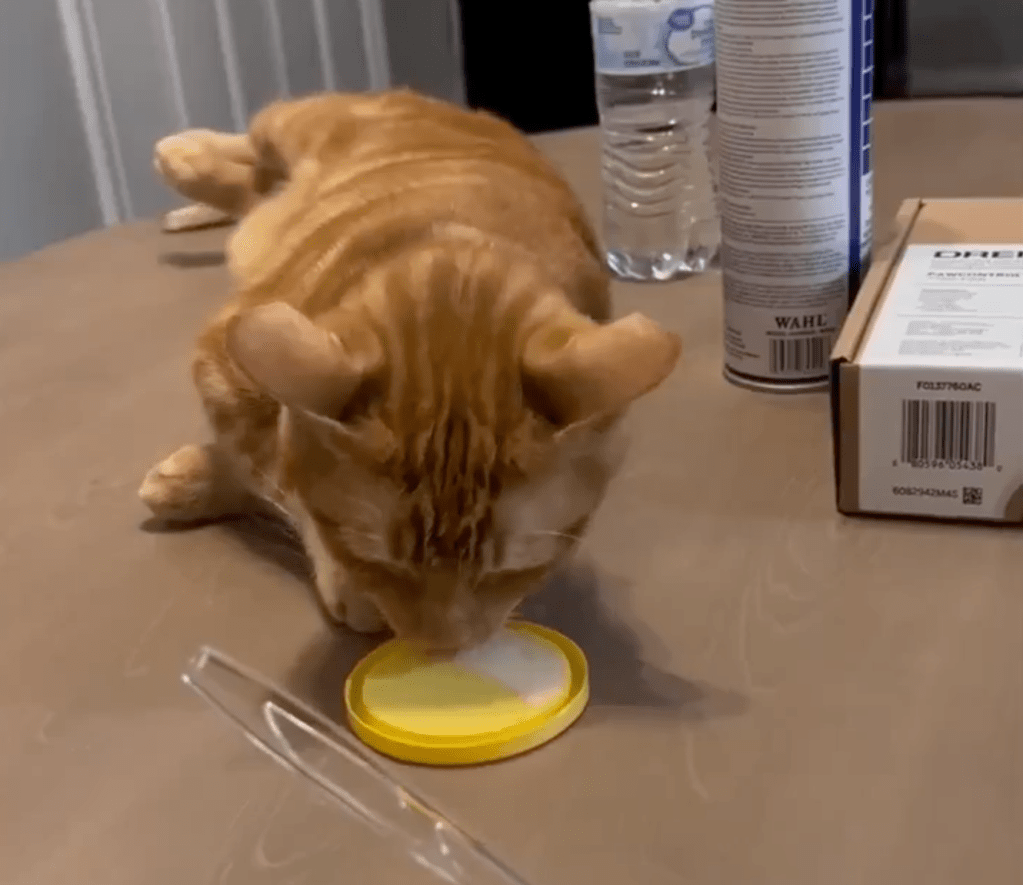 Cat accidentally gets ice cream in her mouth while sleeping lol