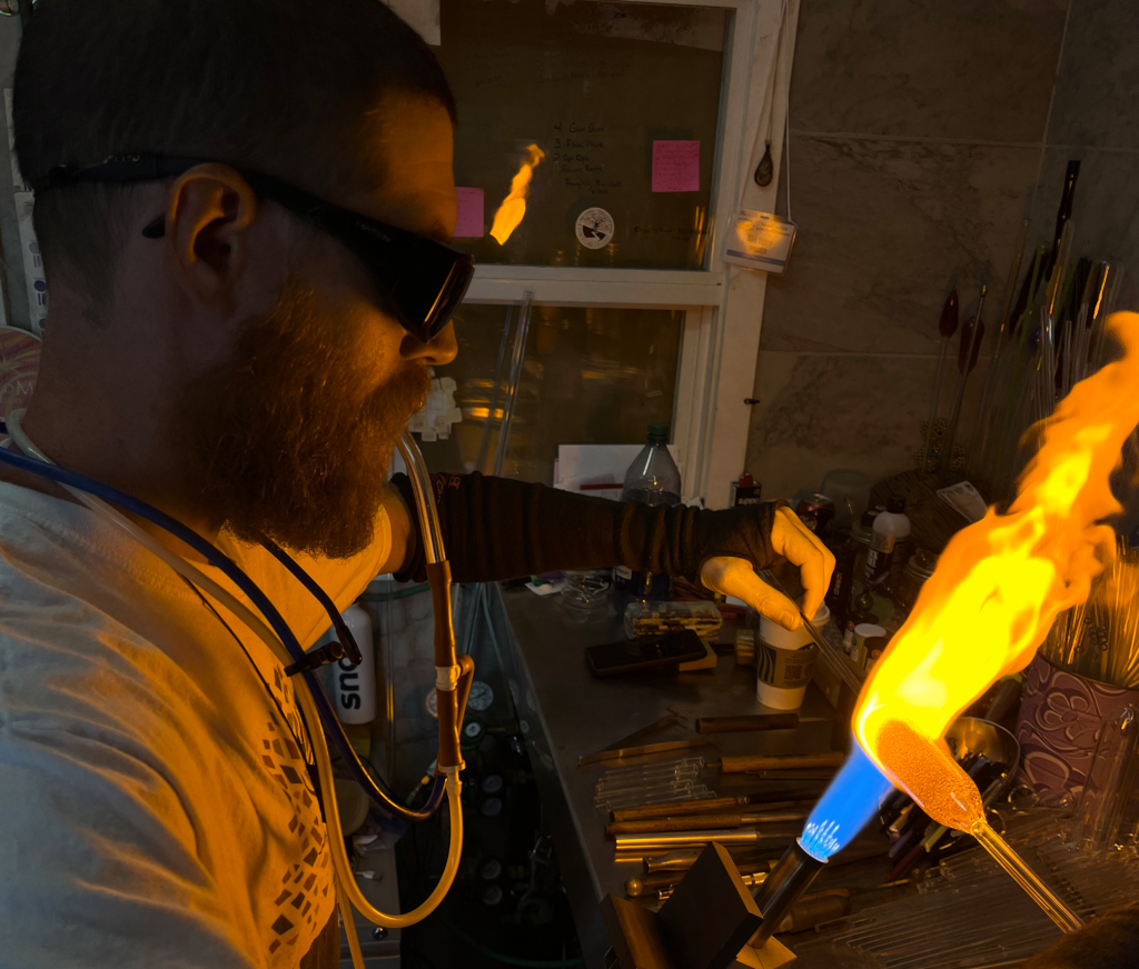 When creating and shaping his pieces, Astral takes the glass and begins to heat it up over his torch while holding it between two long glass rods. One rod is stable, while the other is spun. Using gravity, heat and motion, Astral can begin to form his shape.