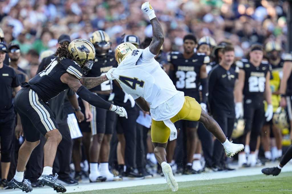 SOUTH BEND, Ind. (AP) — Running back Jeremiyah Love provided Notre Dame’s lone Week 2 rushing highlight when he took a handoff, hurdled a Northern Illinois defender and sprinted 34 yards for the score.