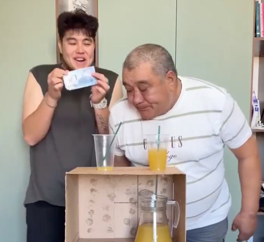 As this father and son compete to win a few bucks with the quickest drinker as the champ, the son really is the winner either way as he sees the confusion growing on his fathers face and delights in it.