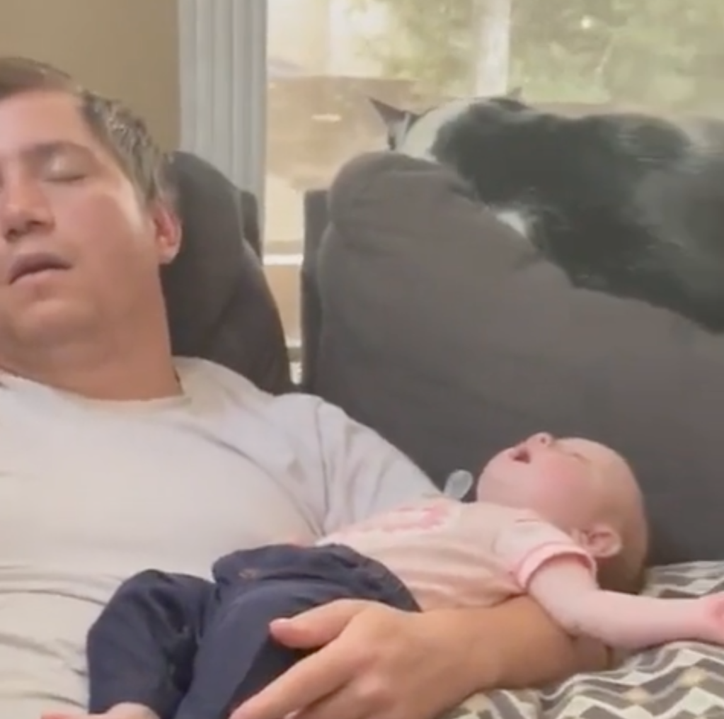 An exhausted dad catches some much needed Zs, as well as the dogs, the cats and, of course, the baby.