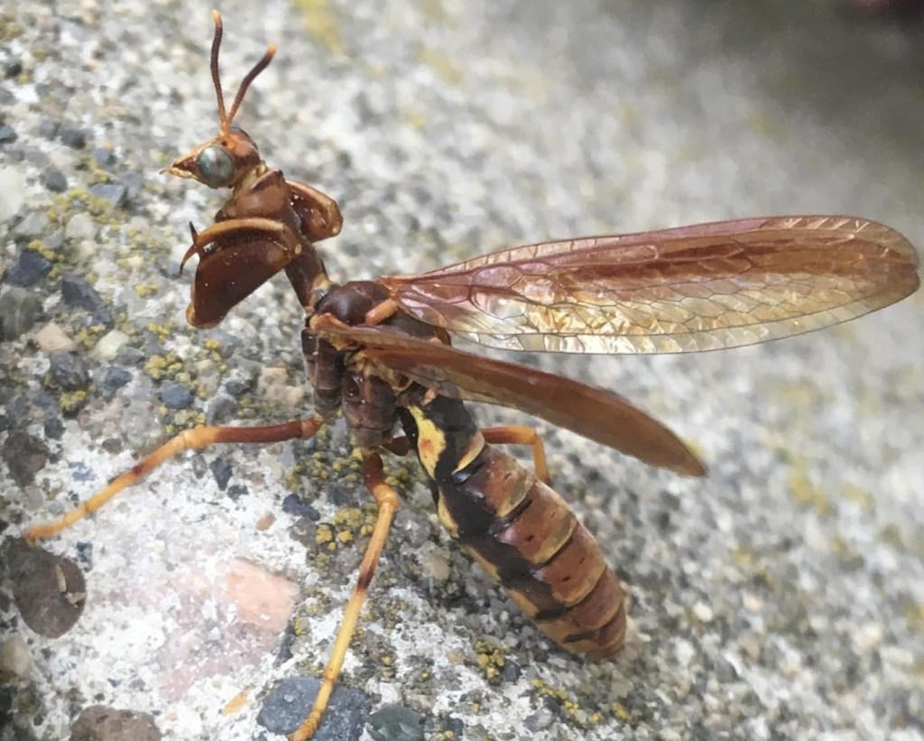 A fascinating looking insect spotted on the front steps of a residence in Kamloops recently appears to be a cross between a praying mantis and a paper wasp, but it is neither.
