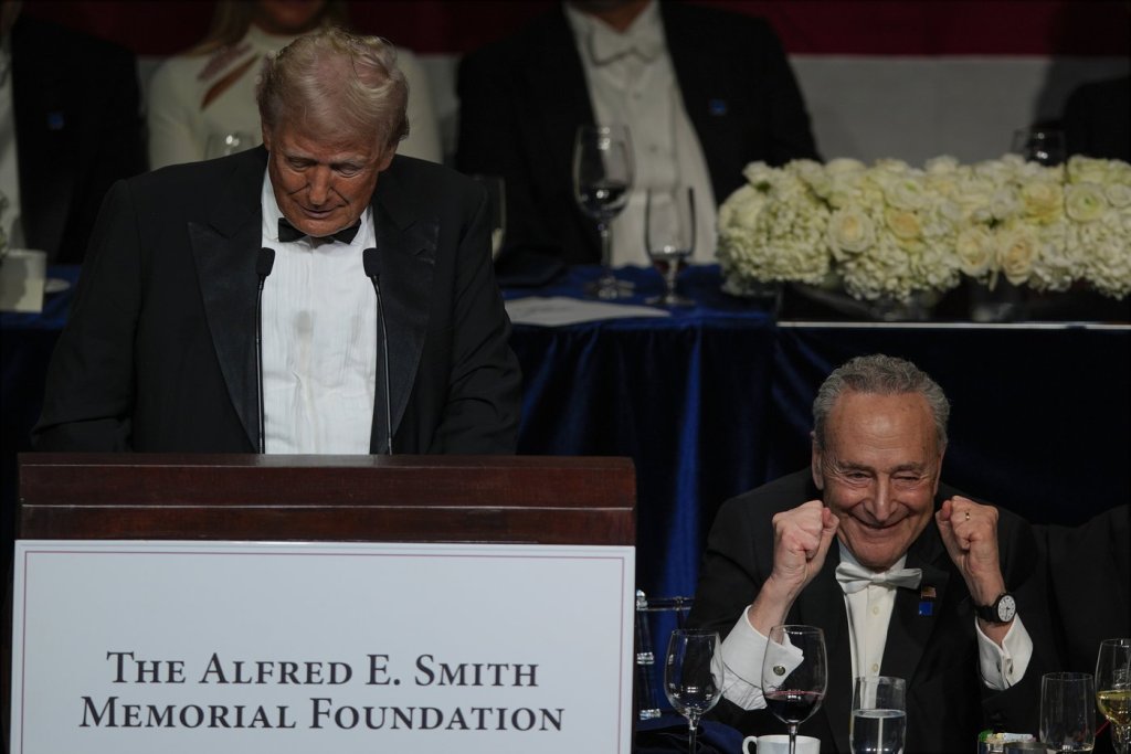 Republican presidential nominee former President Donald Trump speaks at the 79th annual Alfred E. Smith Memorial Foundation Dinner, Thursday, Oct. 17, 2024, in New York, as Senate Majority Leader Chuck Schumer of N.Y., listens. (AP Photo/Julia Demaree Nikhinson)