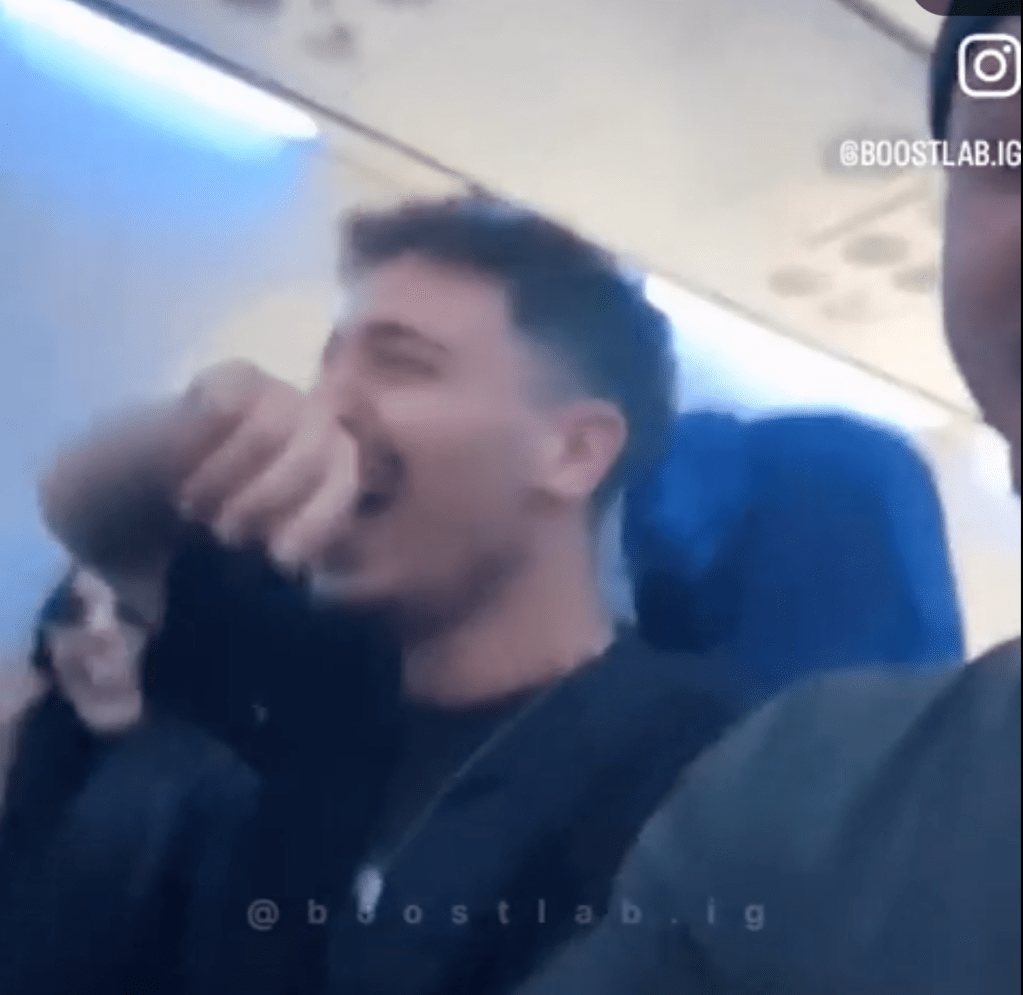 This man's laughter gets some of his fellow plane passengers laughing along with him.