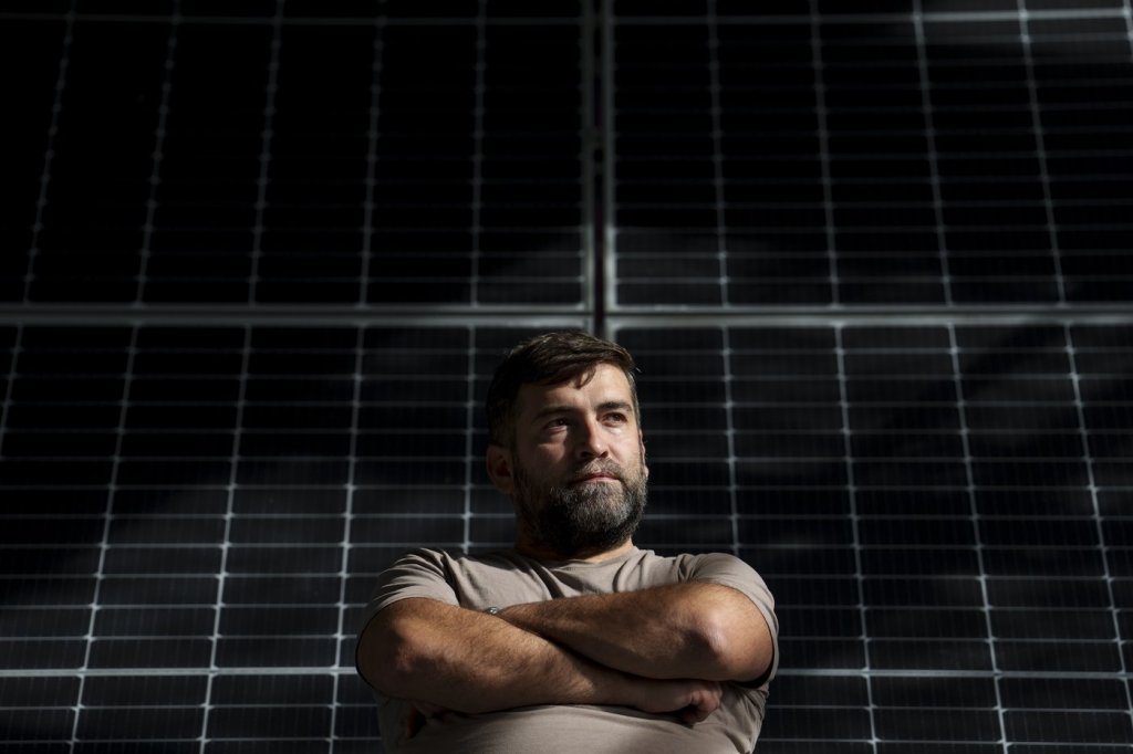 Sebastian Tirintica speaks next to solar panels in the RenewAcad training center in Petrosani, southern Romania, Friday, Oct. 11, 2024. (AP Photo/Vadim Ghirda)