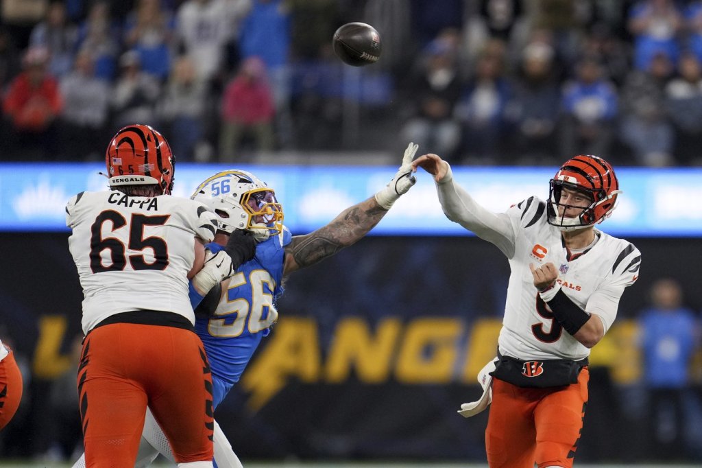 Burrow became the second QB in NFL history to lose consecutive starts when throwing for at least 350 yards and three TDs without an interception in a 34-27 loss to the Chargers on Sunday night. The Bengals rallied from 27-6 down to tie the score in the fourth before Evan McPherson missed two field goals and the Bengals punted in the final minute to set up the Chargers’ game-winning drive.