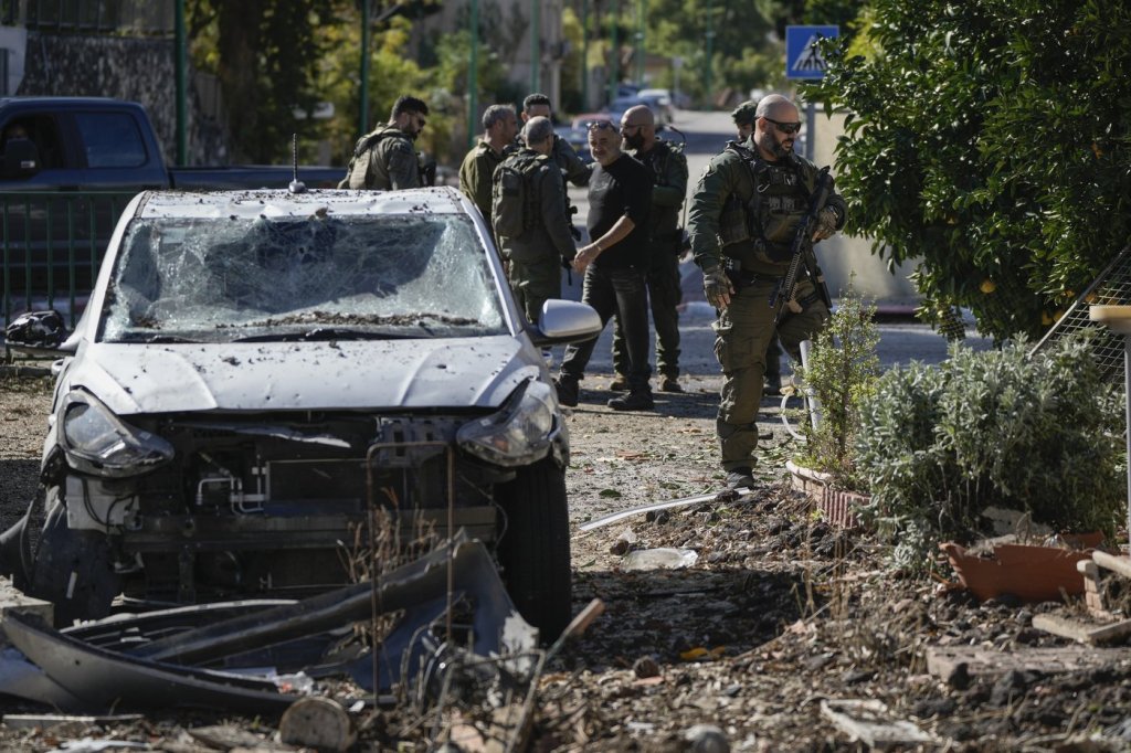 Israeli soldiers inspect the site where a rocket fired from Lebanon landed in a backyard in Kiryat Shmona, northern Israel, Tuesday Nov. 26, 2024. (AP Photo/Leo Correa)
