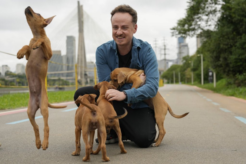Dog trainer Luis Estrela plays with a caramelo dog on the set of Netflix film “Caramelo” in Sao Paulo, Tuesday, Oct. 29, 2024. (AP Photo/Andre Penner)