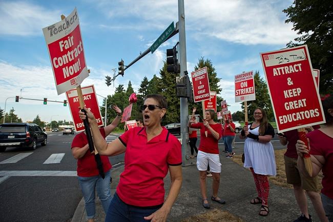 In Vancouver, where teachers in two districts are on strike, dozens of teachers and supporters wore red and lined a street near a high school waving signs, The Columbian newspaper reported Wednesday.