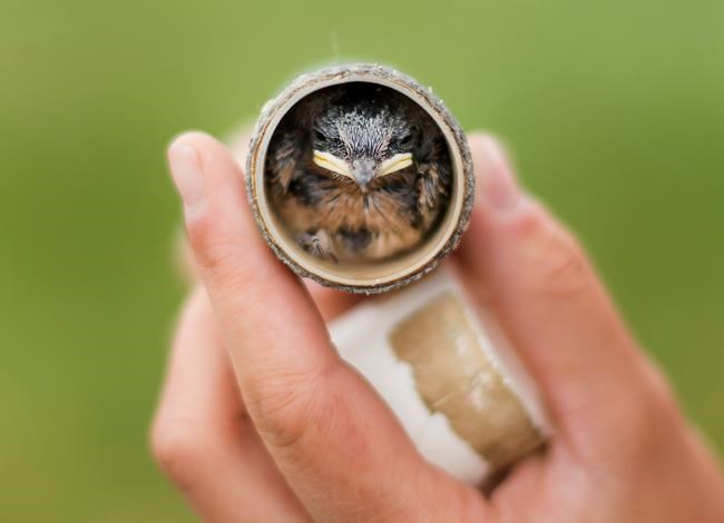 TOWNSEND, Ont. – The long grass sways as a soft summer wind sweeps under two strange structures, blowing with it the faint smell of manure, in an otherwise empty Ontario field. Under one, which looks like a tiny house on stilts, Myles Falconer carefully removes five barn swallow chicks from their nest to have them weighed, measured and banded.