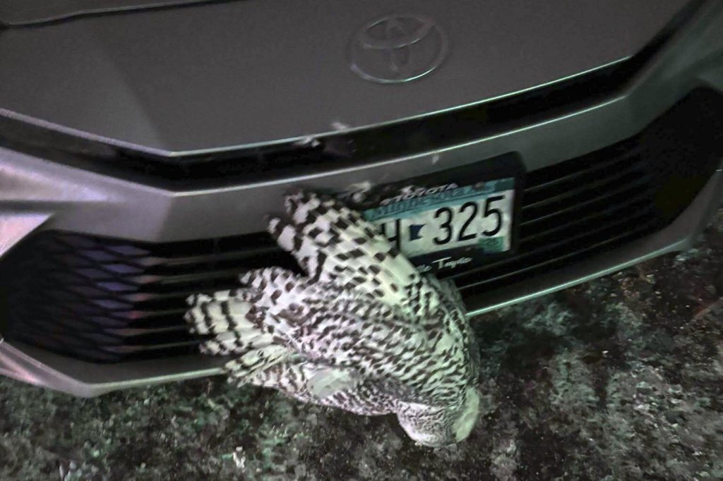 Amazingly, Whelan was out with her boyfriend’s family later Monday in Duluth when she spotted another injured owl — this one the snowy owl that had collided with a car and was in the grille. Since Wildwoods had already closed, Whelan took the snowy owl home for the night.