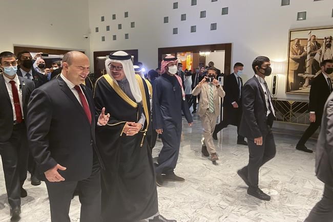 MANAMA, Bahrain (AP) — Israeli Prime Minister Naftali Bennett landed in the Gulf state of Bahrain on Monday, cementing ties between the new allies in a clear message of cooperation aimed at regional archrival Iran.