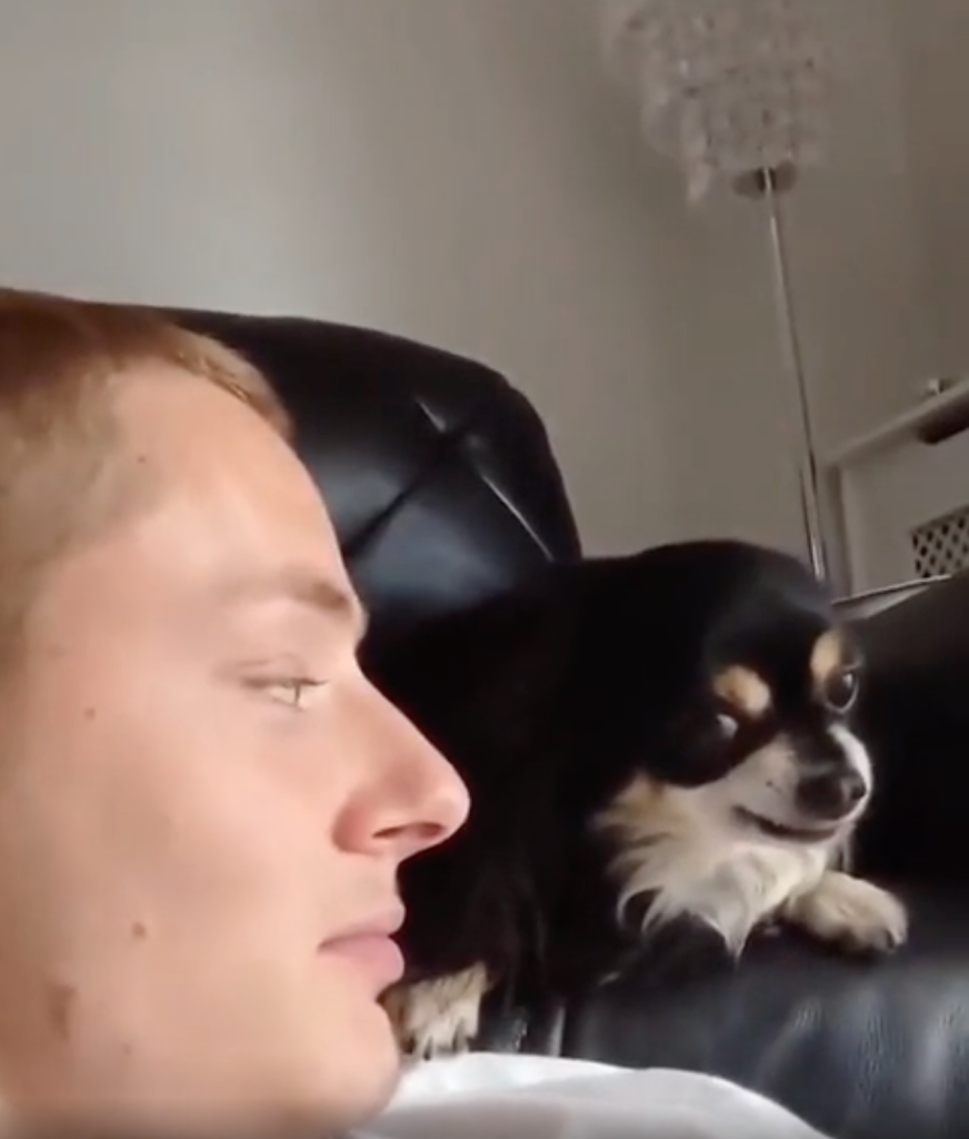 The dog's side eye is hilariously adorable.