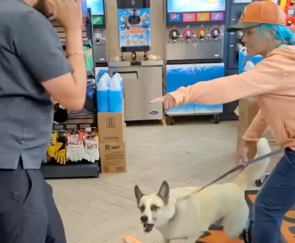 After hurling more slurs and swinging a few punches the woman, a man and their dog leave the store.
