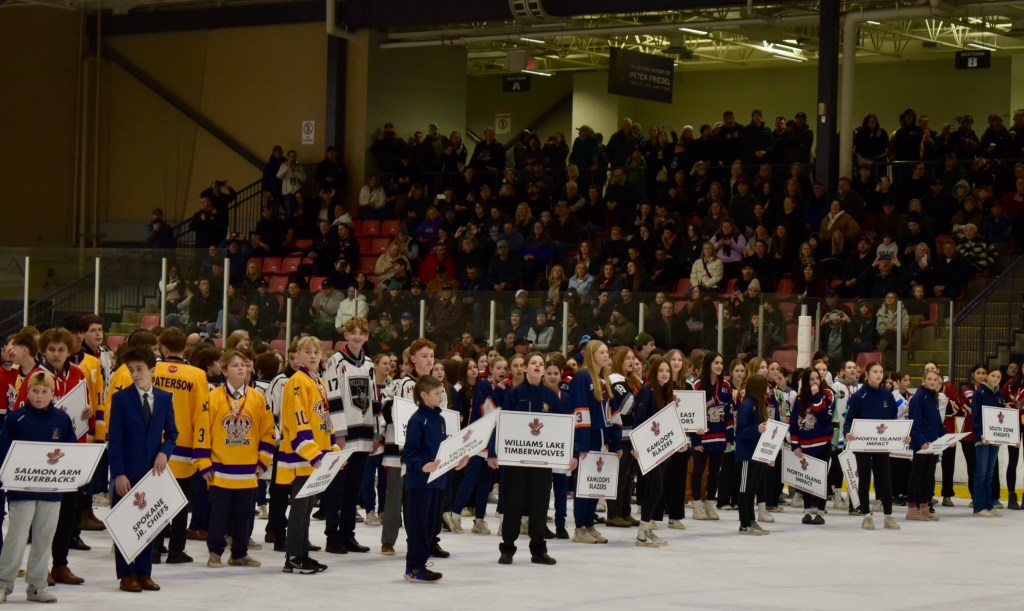 Young players donned in jerseys lined up single file at the gates to the ice. Excitement was palpable in the arena as 38 teams waited to line the blue lines for the Kamloops International Bantam Ice Hockey Tournament opening ceremony.