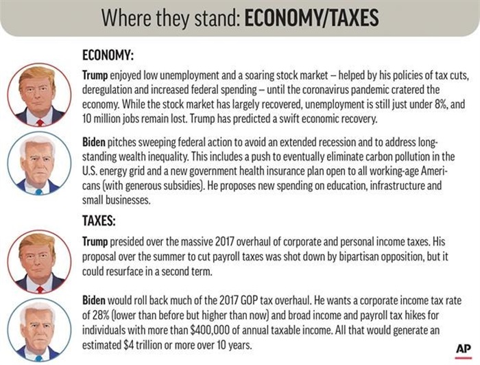 Biden draws some of his sharpest contrasts with Trump on the pandemic, arguing that the presidency and federal government exist for such crises. Unlike Trump, he doesn’t believe the leading role in the virus response should belong to state governors, with the federal government in support.