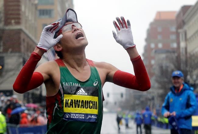 Yuki Kawauchi splashed through the pelting rain, temperatures in the mid-30s and wind that gusted as high as 32 mph to win the men’s race, passing defending champion Geoffrey Kirui in Kenmore Square to earn Japan’s first Boston title since 1987 and the $150,000 first prize.
