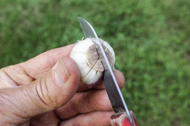 Yet another way to increase the number of bulblets — especially useful with hyacinths, which are naturally shy multipliers — is with “cuttage.” Turn the bulb upside down and score it through its centre, dividing the base into 6 pie-shaped sections. Alternatively, scoop out the base with a knife. Either way, you will have nipped out the growing point within, letting side “shoots,” i.e. bulblets, grow, just like when you make any stem more bushy by nipping out its top bud.