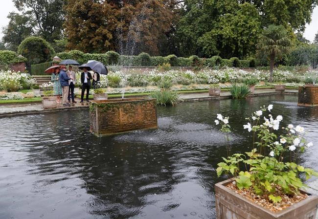 The royals, accompanied by William’s wife, the Duchess of Cambridge, huddled under umbrellas in the pouring rain as they strolled through the Sunken Garden, which is planted with white flowers and dedicated to the princess at her former home, where she once would stroll by and ask the gardeners about their ever-changing displays.