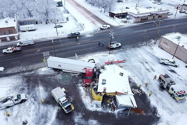 WELLINGTON, Utah – A speeding tractor-trailer skidded off a snow-slicked road Wednesday and crashed into a restaurant in a small Utah town, flattening the establishment and injuring 3 people, authorities said.