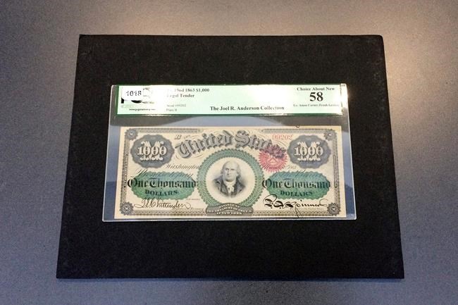 Stack’s Bowers Galleries says the bill is one of only two of its kind available to collectors. The U.S. Treasury Department says thousand-dollar bills haven’t been printed in the U.S. since 1945 . U.S. founding father Robert Morris of Pennsylvania is pictured on the bill.