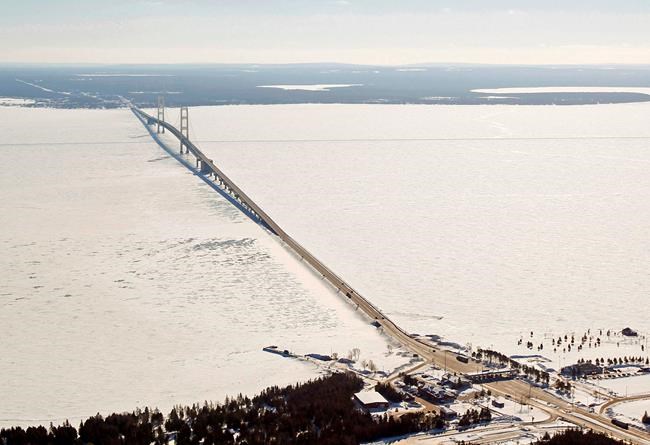 Line 5 carries about 23 million gallons (87 million litres) of crude oil and liquefied natural gas daily between Superior, Wisconsin, and Sarnia, Ontario. The segment that crosses the 5-mile-wide (8-kilometre-wide) straits linking Lakes Huron and Michigan is divided into two side-by-side pipes that were laid on the lake bottom in 1953.