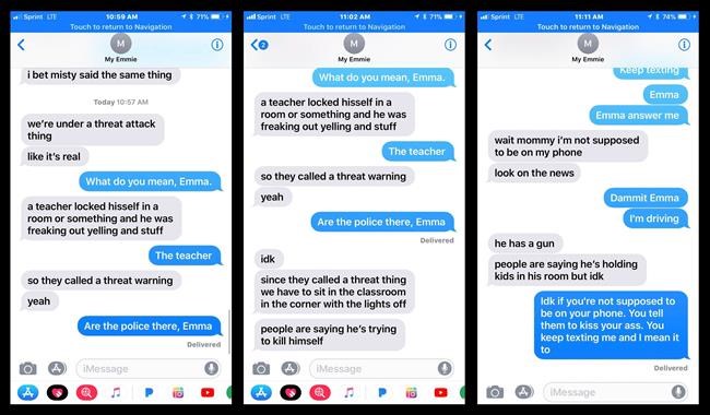 Student Emma Jacobs texted her mother while she hid inside a darkened classroom, said her mother, Annmarie Jacobs. Emma, a junior, said in texts that her teacher had turned the lights off and told the students to sit in a corner.