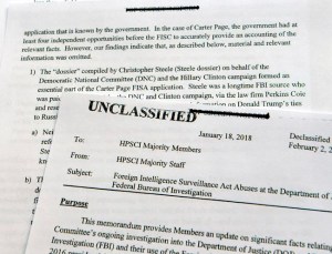 The memo’s central allegation is that agents and prosecutors, in applying in October 2016 to monitor Page’s communications, failed to tell a judge that the opposition research that provided grounds for the FBI’s suspicion received funding from Hillary Clinton’s presidential campaign and the Democratic National Committee. Page had stopped advising the campaign sometime around the end of that summer.