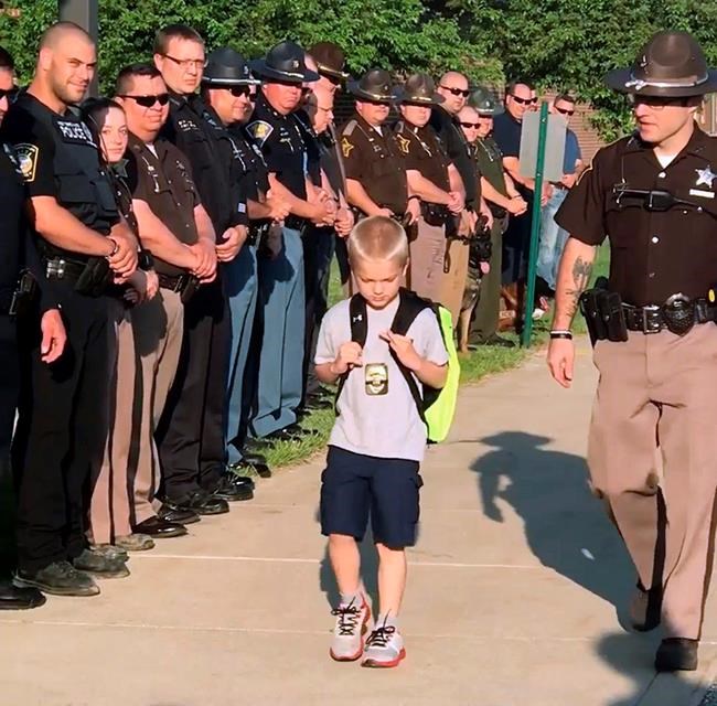 TERRE HAUTE, Ind. – About 70 law enforcement officers welcomed the five-year-old son of a slain police officer to a western Indiana school as he returned to class for the first time since his father was killed in a shootout.