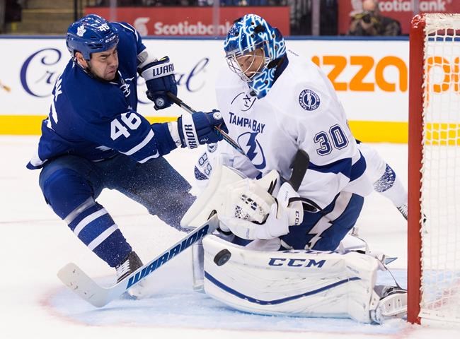 Bishop was dazed by a Peter Holland wrist shot late with 6:40 in the second period of Tampa’s 7-3 win over the Maple Leafs. The hard shot went through the legs of defenceman Andrej Sustr and hit Bishop in the mask, jarring his two front teeth — both crowns — loose.