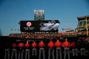 The Angels charged from the dugout and gathered in celebration near home plate. Then, all the Angels players, who were wearing Skaggs’ No. 45 on their jersey, covered the pitching mound with the jerseys as a tribute to Skaggs, on the eve of what would have been his 28th birthday.