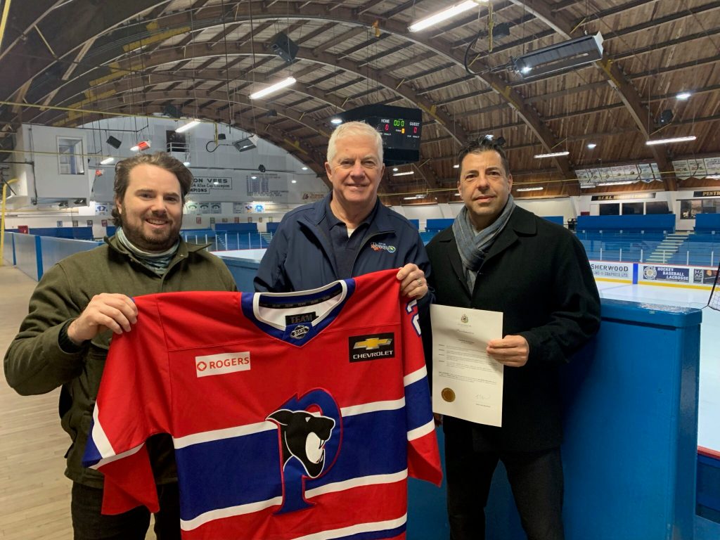 On Monday, Jan 6, Penticton Mayor Julius Bloomfield, along with Councillor Isaac Gilbert and Vees President, General Manager and Head Coach, Fred Harbinson, declared Jan. 11 as Panthers Pride Day in the City of Penticton.