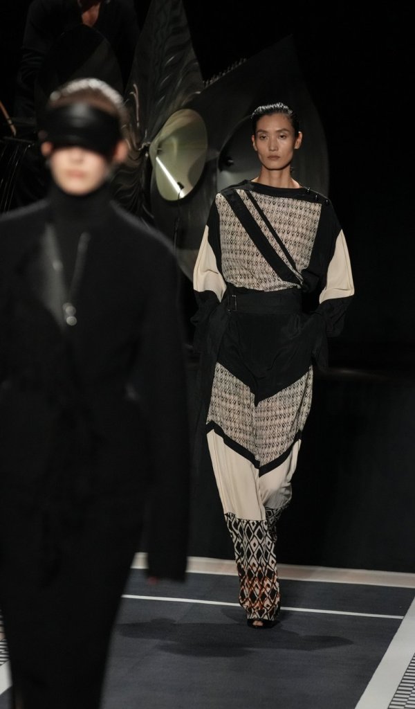 Graphic patterns and motifs drawn from Jeanne Lanvin’s own home infused the collection with Art Deco sophistication. A standout was a black velvet cape traced with silver studs, paired with a sheer blouse and tailored trousers. Eveningwear took center stage, with dramatic creations like spiral-draped ribbon dresses and mirror-embroidered pieces showcasing Copping’s mastery of couture gestures.