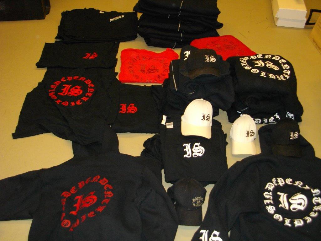 Inside, police found a high-powered, prohibited handgun, a 20-gauge shotgun, an AR-style .22 calibre rifle, assorted ammunition, a crossbow and drug paraphernalia. The cops also found three big boxes of new clothing with the Independent Soldiers logo.