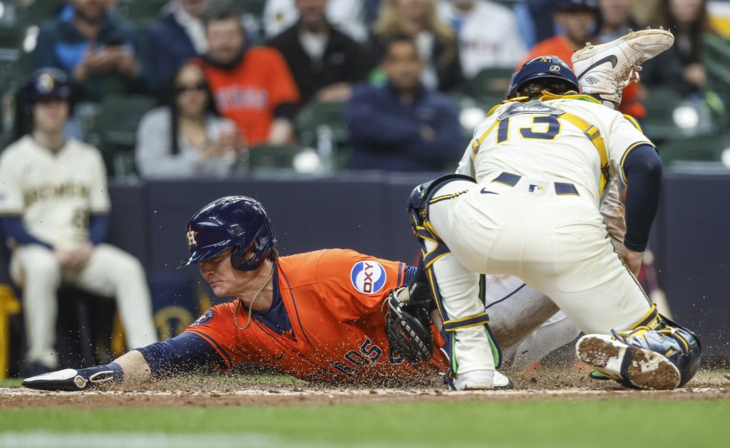 The Astros led 1-0 and had runners on third and second with one out in the fifth when Peña hit a bouncer to third. The throw home beat Dezenzo to the plate. Home plate umpire Chris Conroy initially ruled Dezenzo out, but the Astros challenged the call and replays showed the runner slid home ahead of Haase’s tag.