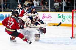 Leslie opened the scoring at two minutes of the first period on a rebound on a 2-on-1 break with Anna Meixner. Meixner, on the right side, kept the puck and fired a shot that went off goalie Ann-Renee Desbiens’ left pad to Leslie.