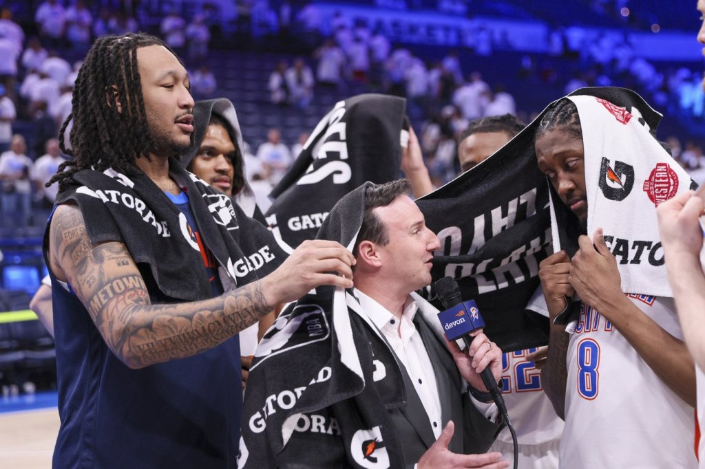 They’ve come out with T-shirts bearing his name and likeness. They’ve made him bark like a dog before they’ll let him sign off. They come up behind him when he’s talking and dust off his shoulders. They stacked so many towels on his head, neck and shoulders during one interview that NBA MVP Shai Gilgeous-Alexander finally had to intervene.