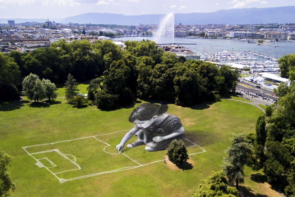 Only aerial shots do justice to the painted grass image of a young girl sketching a chalk outline of a soccer field. It was created by artist Saype in a lakeside park, looking up to the 18th-century villa that hosted a 2021 diplomatic summit between then-U.S. President Joe Biden and Russian President Vladimir Putin.