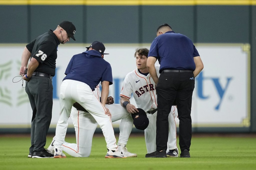 Meyers, who had missed the last two games with a right calf injury, jogged onto the field before the game but soon summoned the training staff, who joined him on the field to tend to him. He remained on the field on one knee as manager Joe Espada joined the group. After a couple minutes, Meyers got up and was helped off the field and to the tunnel in right field by a trainer.