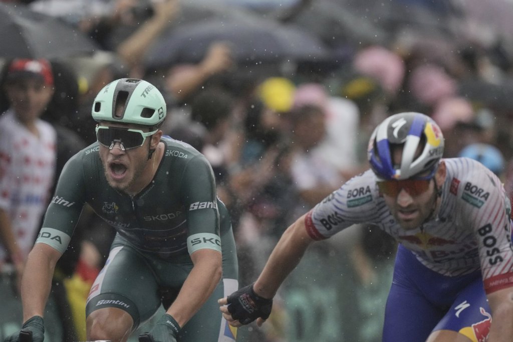 Italian rider Milan, the green jersey holder, consolidated his lead in the points classification with an explosive finish to get his wheel just over the line ahead of Jordi Meeus, Tobias Lund Andresen, Arnaud De Lie, Davide Ballerini and others in a rain-soaked sprint finish.