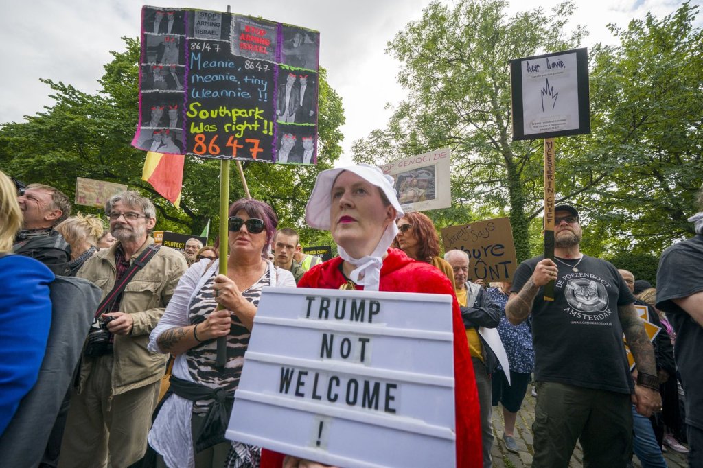 But, as bagpipes played, people chanted “Trump Out!” and raised dozens of homemade signs that said things like “No red carpet for dictators,” “We don’t want you here” and “Stop Trump. Migrants welcome.”